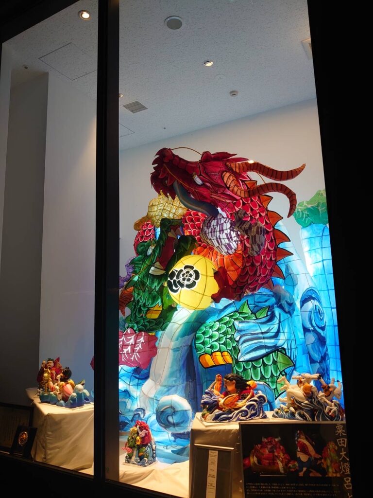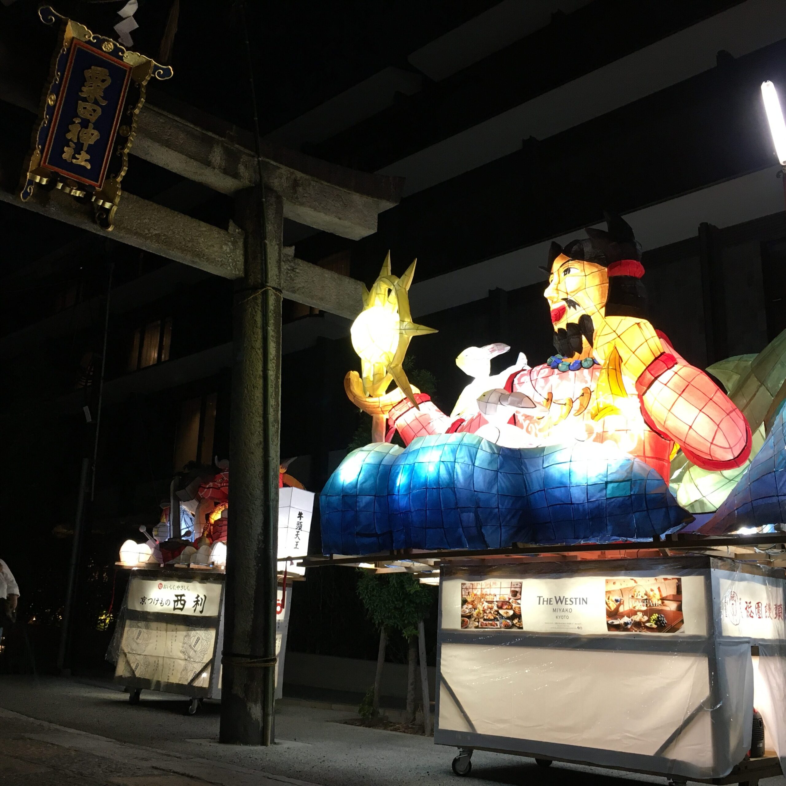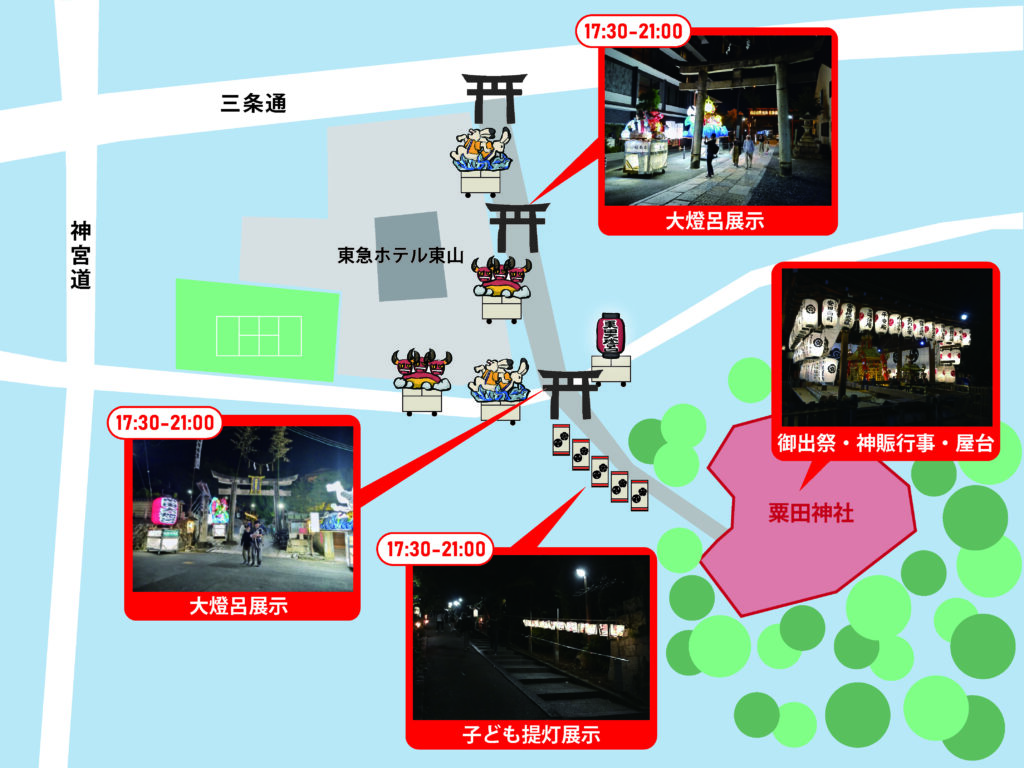 粟田祭の期間外は、京都東山にある東急ホテル東山の正面(三条通)と中庭のショーウィンドウに常時展示されています。中庭の大燈呂の点灯時間は18-22時で、ホテル利用者以外でもご自由にご覧頂けます。足湯も楽しめます。