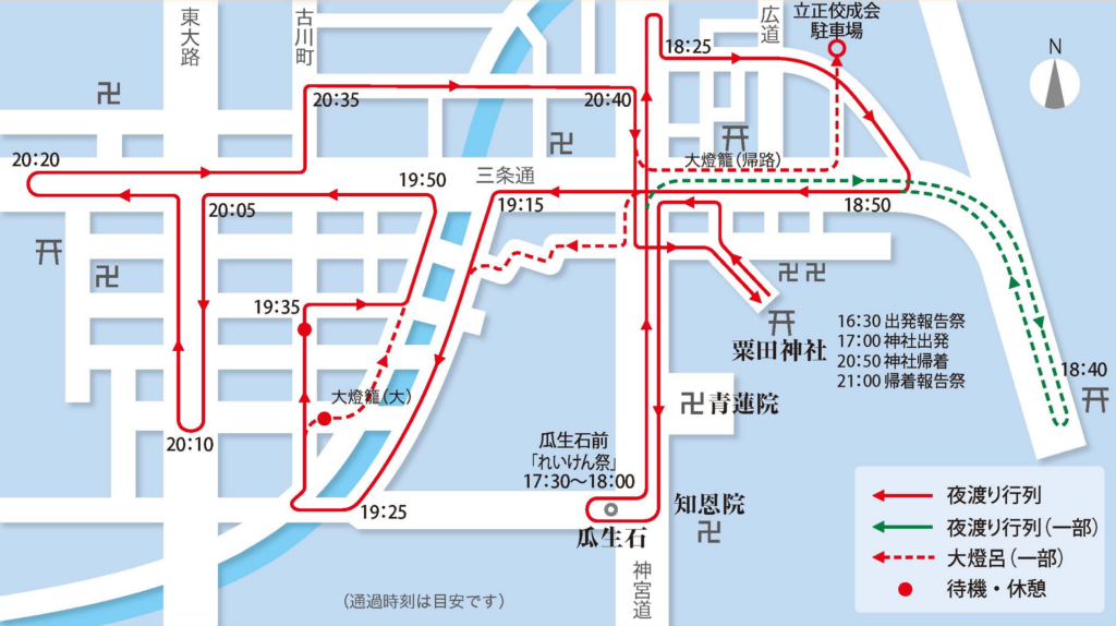 粟田祭2日目の夜は、夜渡神事が斎行されます。17:00に粟田神社を出発する鉾や松明などの夜渡行列に、東急ホテル東山前で大燈呂が加わります。神宮道を通り知恩院瓜生石前まで巡行した後、神仏習合の儀式である「れいけん祭」を17:30頃から執り行います。その後白川沿い、三条通、古川町商店街などを通り、約4時間をかけて氏子区域を巡行します。松明に剣鉾、太鼓に笛の音、「ほいっと〜ほいっと〜」の掛け声が響き渡る粟田の夜に、大燈呂が鮮やかなあかりを灯します。
