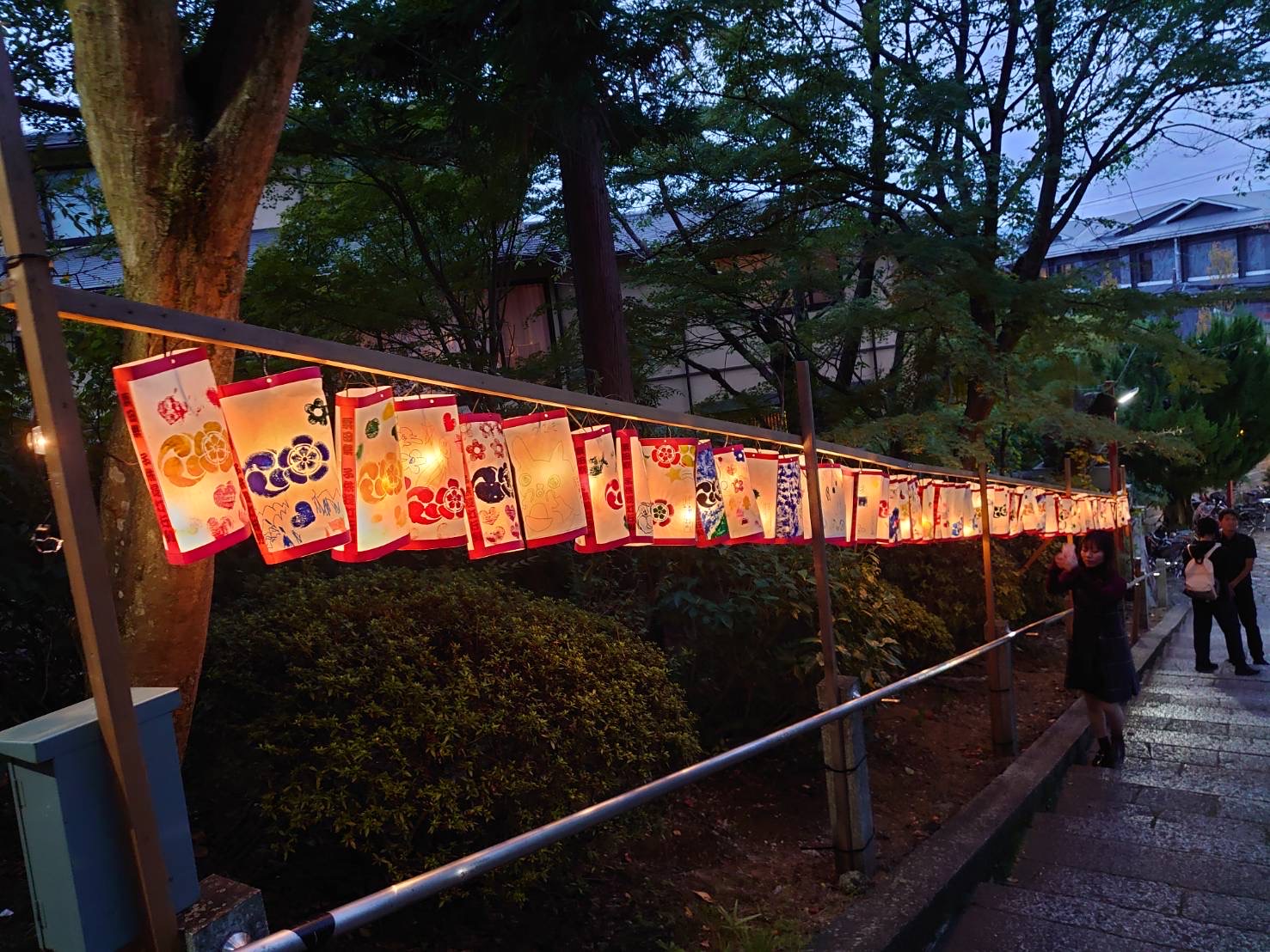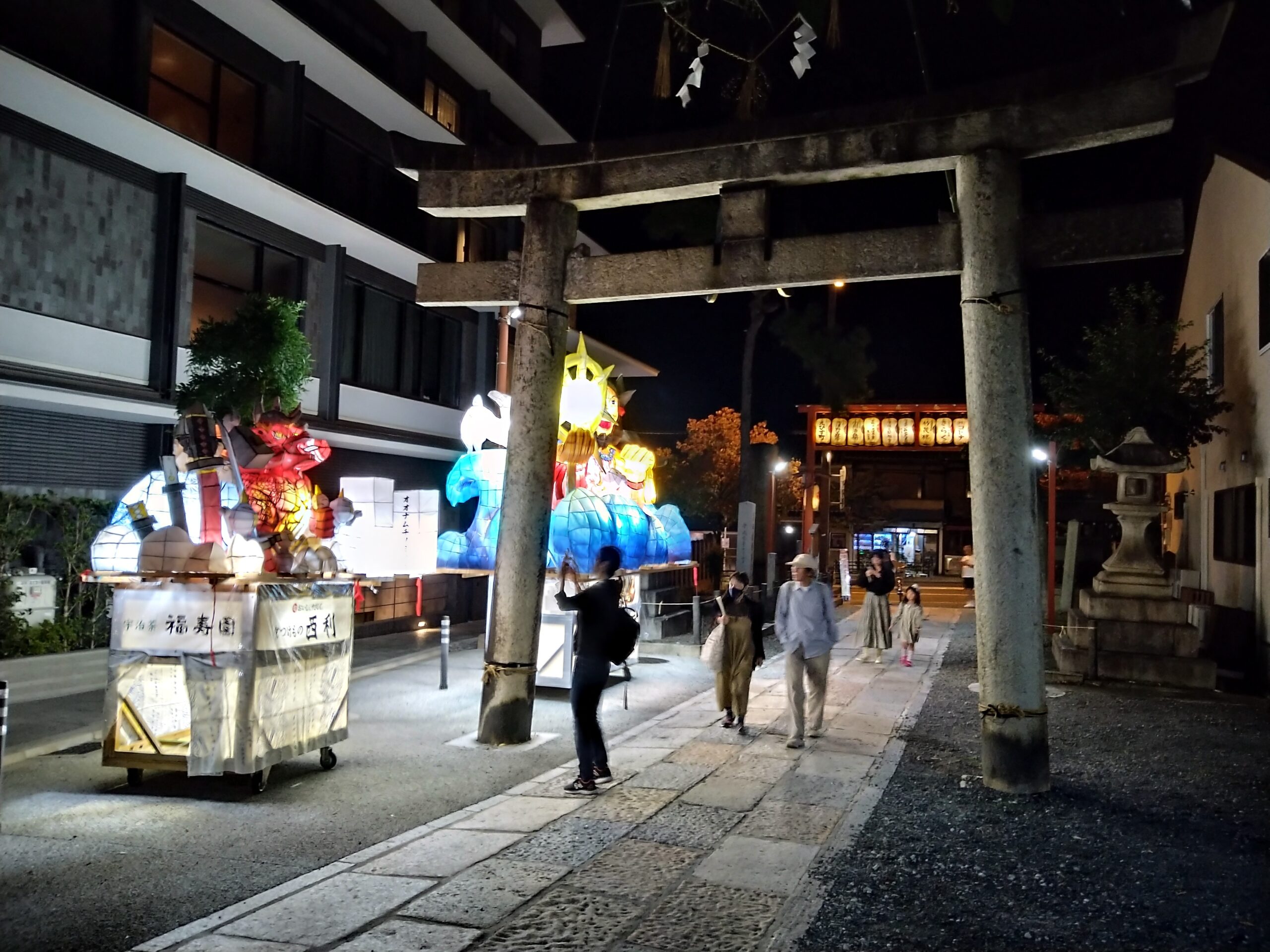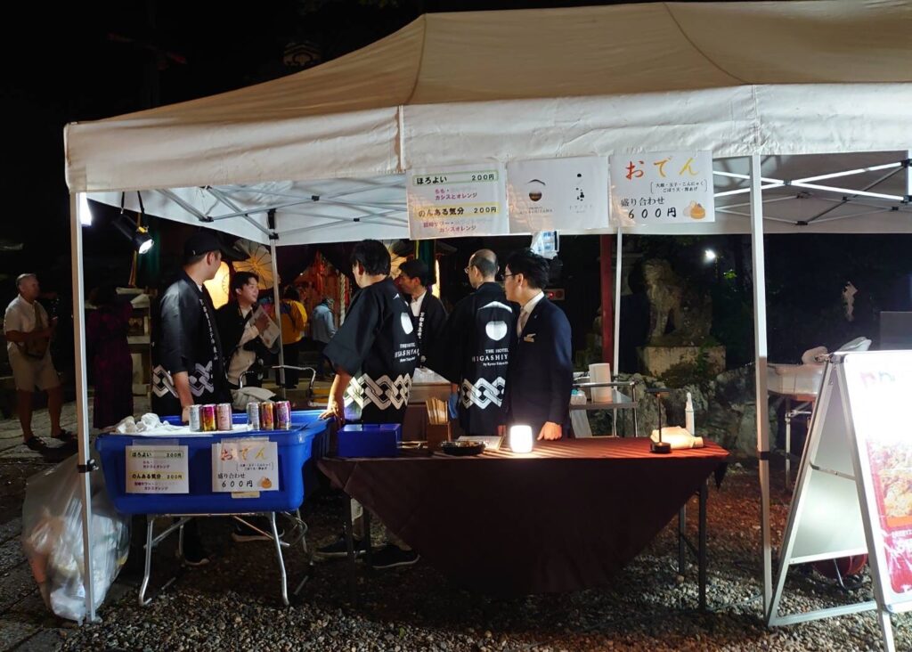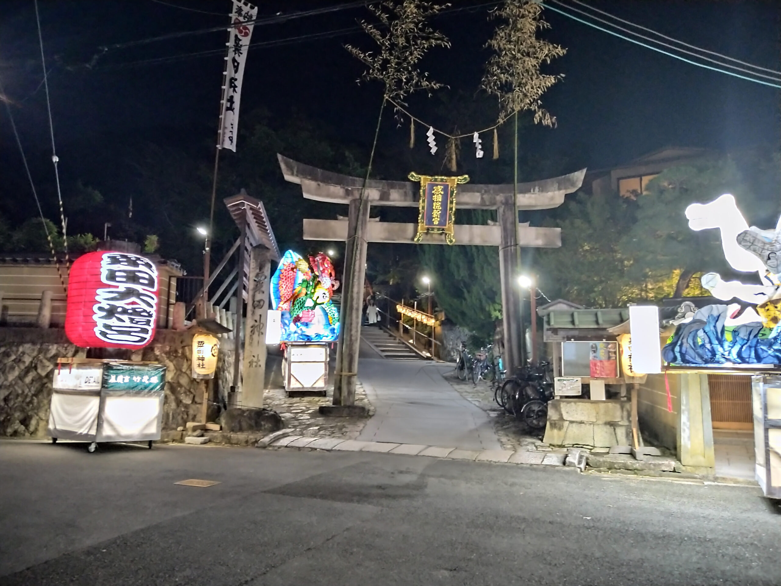粟田祭1日目、粟田神社では粟田祭のはじまりの儀式として、神輿に御神霊をお遷しする御出祭が執り行われ、石見神楽や祇園囃子(平成女鉾清音会)などが奉納される神賑行事が斎行されます。境内には出店も並び、多くの人で賑わいます。粟田大燈呂は参道周辺にずらりと展示され、子ども提灯は境内へ続く坂に並び、粟田神社に足を運ぶ人々を出迎えます。