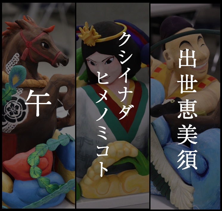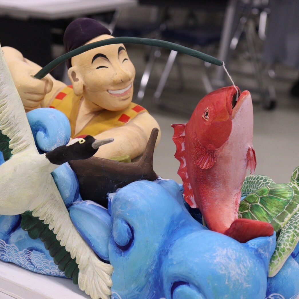 粟田神社の摂社である出世恵美須神社に祀られている細見の恵美須様。牛若丸としてしられる源義経が奥州に旅立つ前に源氏再興を祈願した恵美須神である。本作品は「福禄寿喜」をテーマとしており、来られた方々が心豊かで長く幸せな人生になって欲しいという願いが込められている。また周囲には釣り竿や鯛、鶴や亀、宝袋など、多くの福も表現されている。恵比須様は粟田大燈呂スタッフと同じ黄色の法被を着ている。