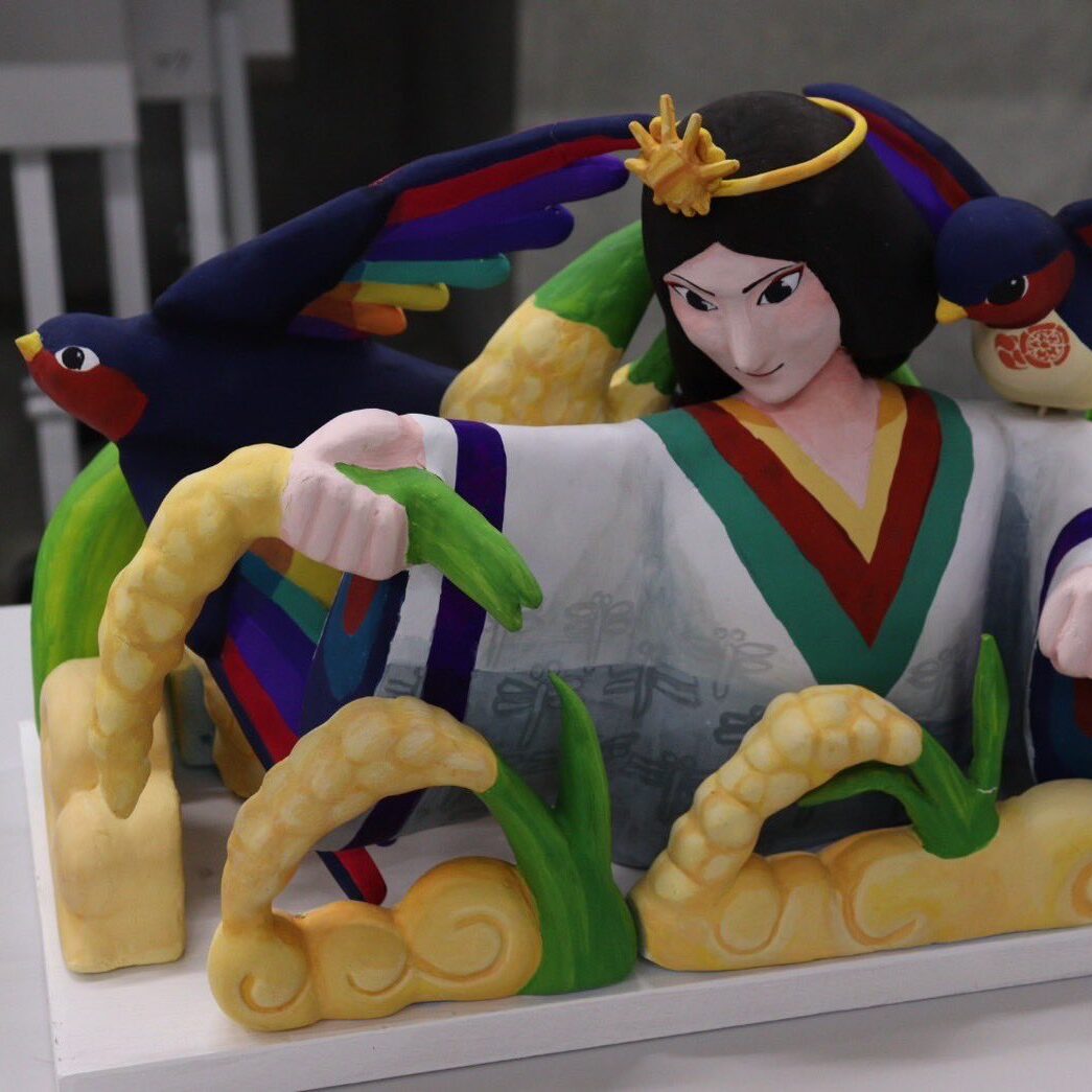 粟田神社の主祭神の一柱で、衣食住守護のご利益があるといわれている奇稲田比賣命(くしいなだひめのみこと)。神社の右座に祀られている。益鳥として大切にされてきたツバメと繁栄の象徴である稲を乗せており、粟田地域の人々の生活が災いから守られ、豊かであってほしいという思いが込められている。