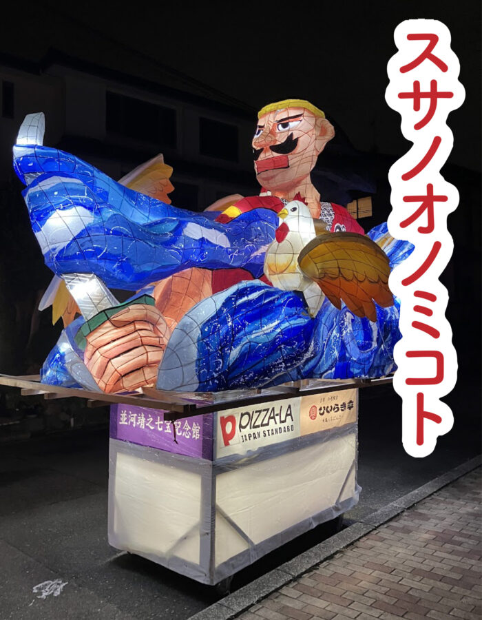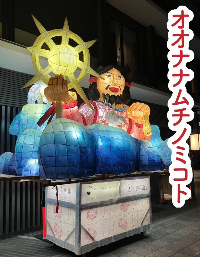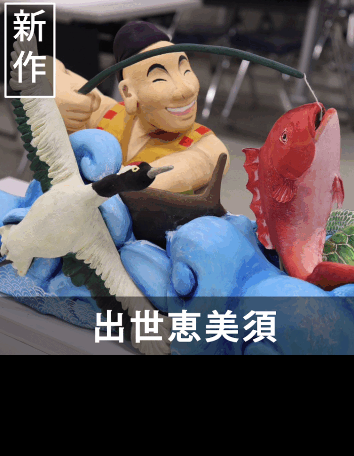 粟田神社の摂社である出世恵美須神社に祀られている細見の恵美須様。牛若丸としてしられる源義経が奥州に旅立つ前に源氏再興を祈願した恵美須神である。本作品は「福禄寿喜」をテーマとしており、来られた方々が心豊かで長く幸せな人生になって欲しいという願いが込められている。また周囲には釣り竿や鯛、鶴や亀、宝袋など、多くの福も表現されている。恵比須様は粟田大燈呂スタッフと同じ黄色の法被を着ている。