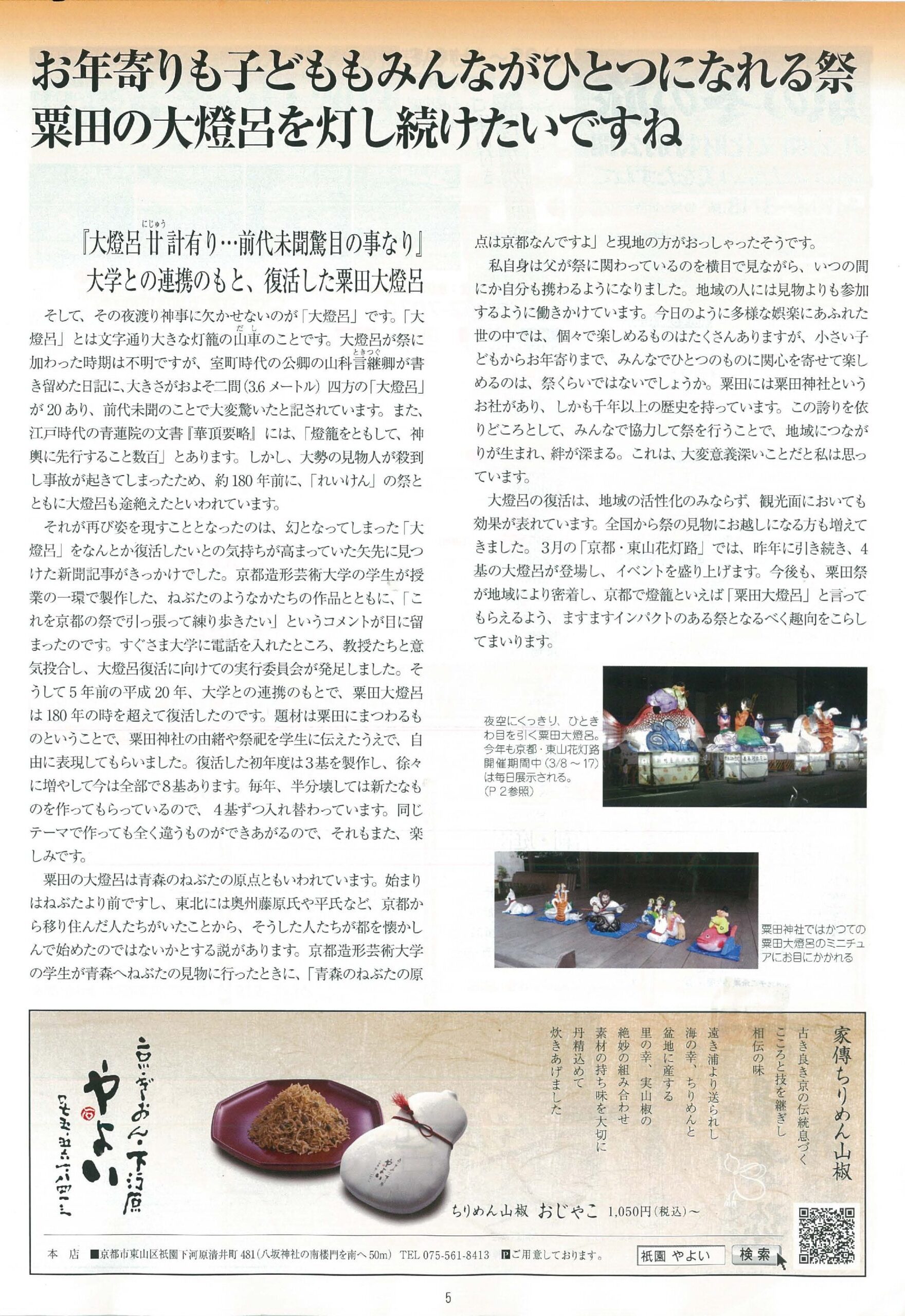 記事訂正:P5本文20行目 初年度は当初3基が巡行予定でしたが、実際は5基となりました。