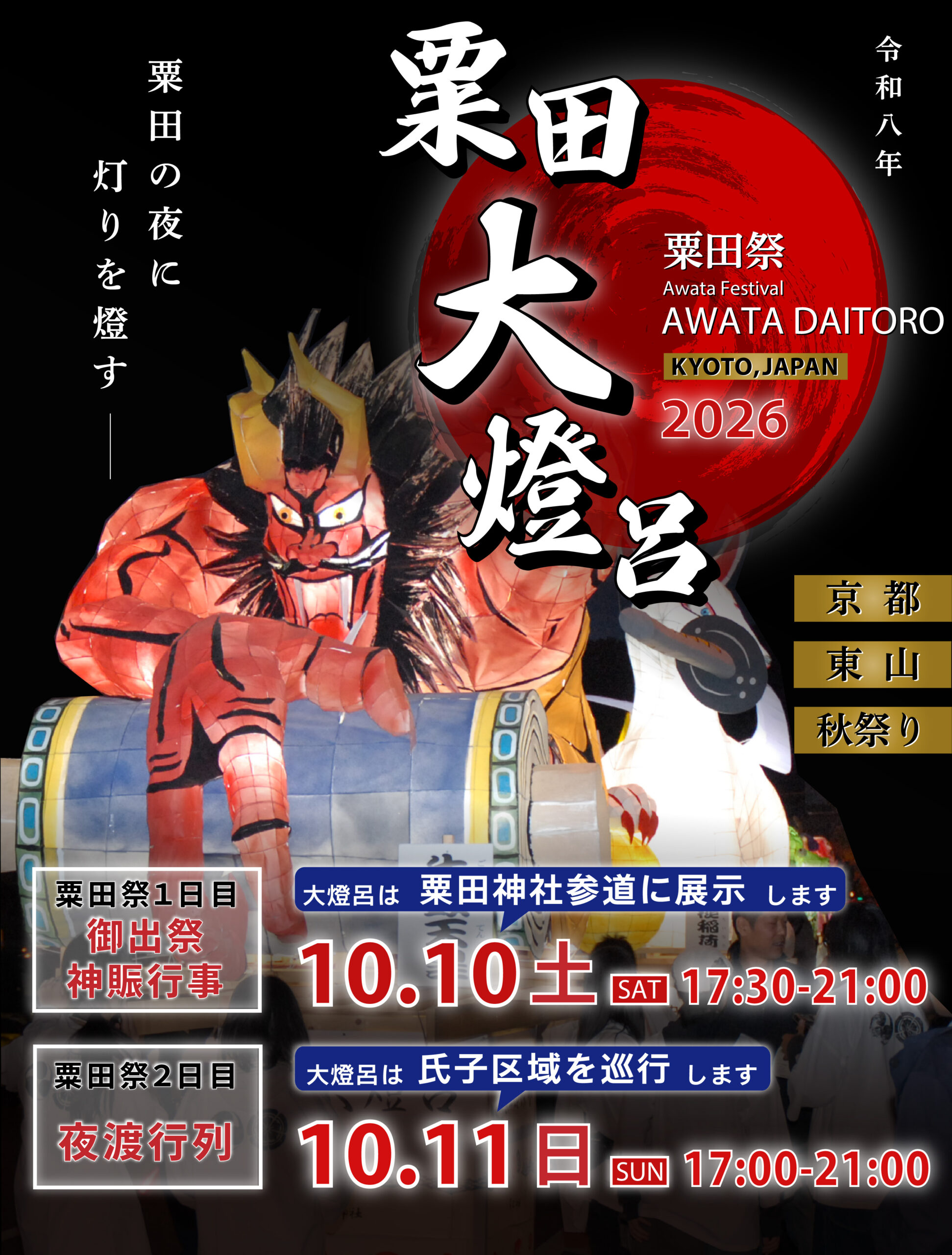 「粟田大燈呂(あわただいとうろ)」とは、毎年10月に行われる粟田神社(京都市東山区)最大の祭礼である「粟田祭」で巡行する、高さ4mにもなる大きな灯篭の山車で、干支や氏子地域ゆかりの祭神がモチーフとなっています。青森ねぶたの源流とも言われています。大燈呂は粟田祭の1日目の御出祭(おいでまつり)・神賑行事(しんしんぎょうじ)にて粟田神社参道に展示され、2日目の「夜渡神事(よわたりしんじ)」で夜渡行列の一部として、剣鉾や松明、笛太鼓とともに粟田の夜を鮮やかに彩りながら氏子区域を巡行します。