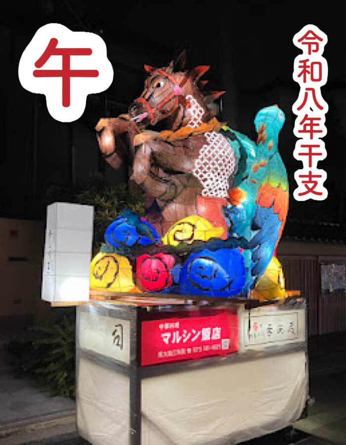 来年の干支である午(うま)を表現。粟田の地では御神馬として人々の旅路の安全を祈る象徴として多くの参拝者に親しまれている。時代を駆け抜ける力強さや未来を切り開く原動力と、粟田地域の希望と繁栄、未来への祈りが込められている。祭後は東急ホテル東山の正面(三条通)ショーウィンドウへ展示される予定。