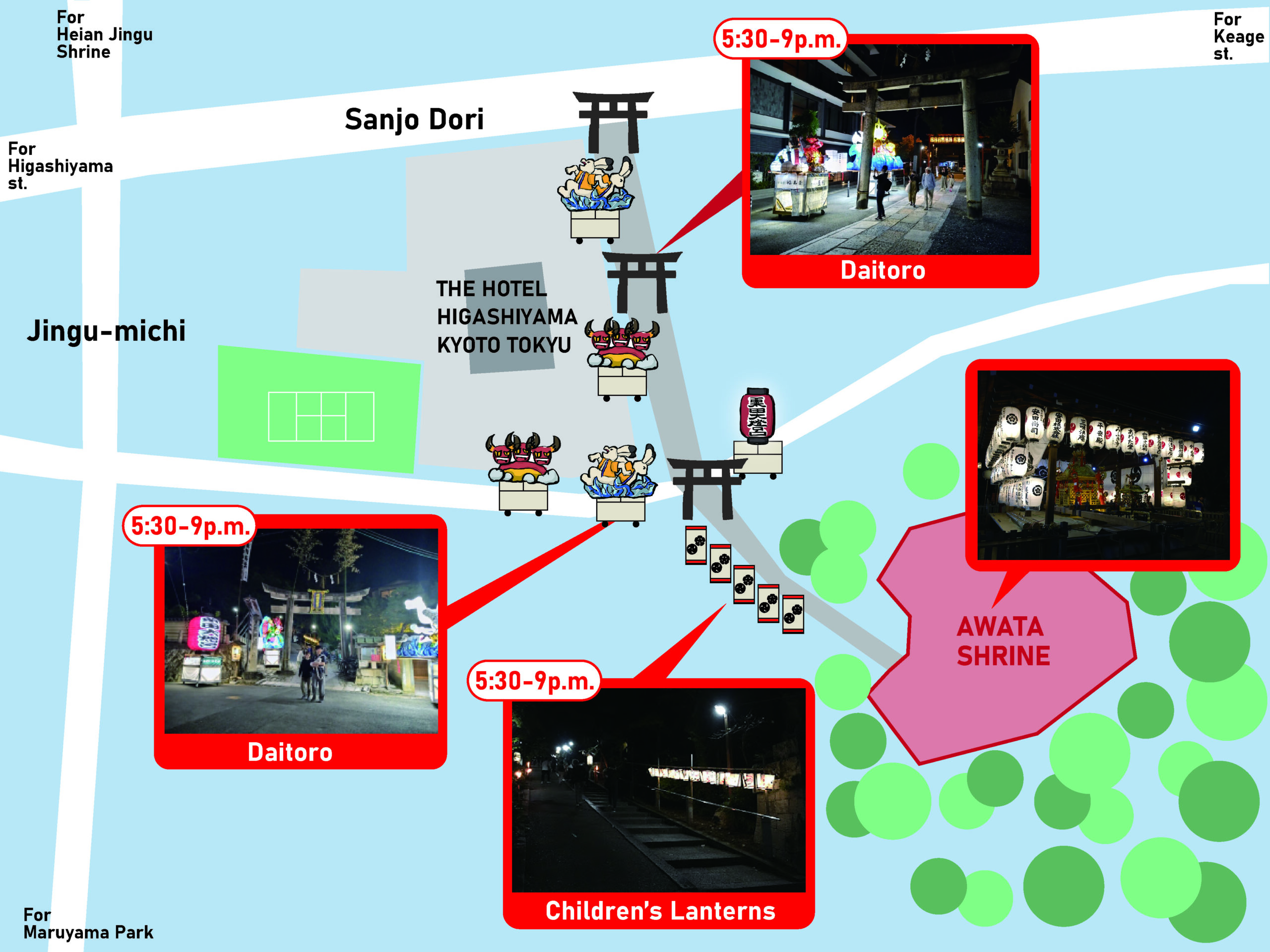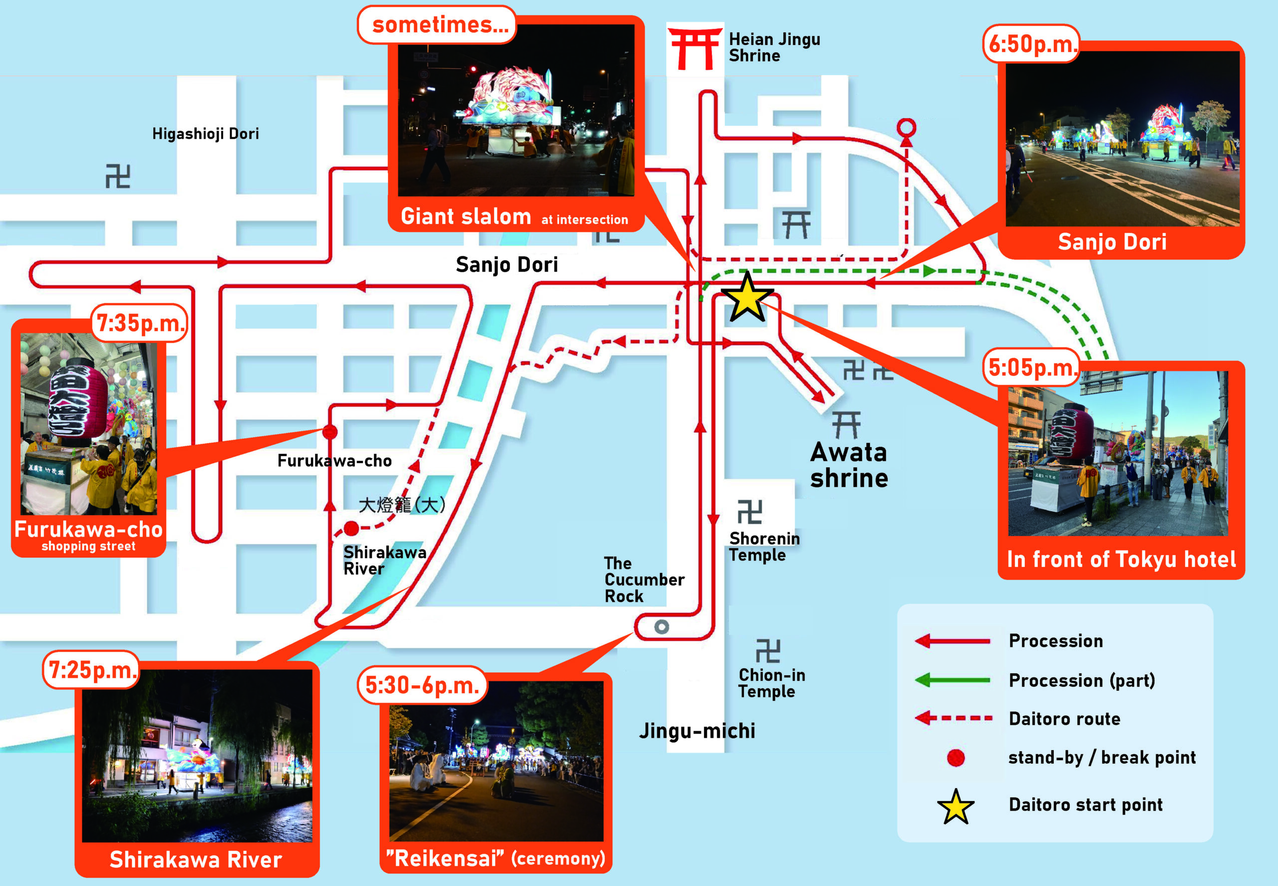 Times are approximate and may vary.”Daitoro” depart from in front of ”THE HOTEL HIGASHIYAMA KYOTO TOKYU” at 5:05p.m.”Reikensai”(ceremony)held in front of Chion-in Temple at 5:30p.m.Return in front of ”‘THE HOTEL HIGASHIYAMA KYOTO TOKYU” at 9p.m.